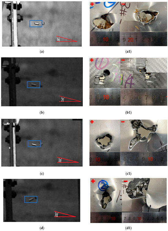 Result of deflecting fragments impacting the honeycomb sandwich structure. (a) NOMEX-AL; (a1) NOMEX-AL Destroying results; (b) NOMEX-C; (b1) NOMEX-C Destroying results; (c) ST-6-6; (c1) ST-6-6 Destroying results; (d) ST-6-3; (d1) ST-6-3 Destroying results. The “+” in the picture represents the front view; “-” indicates the back.