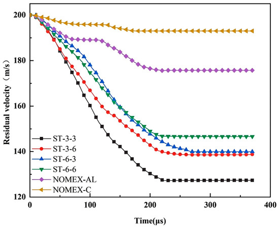 Figure 8 shows the six types of structures when the fragment is 200 m/s and the impact angle is 40°. It can be seen from the residual velocity curve of the structure in the figure that the residual velocity curves of the six cases are clearly distinguished. The velocity change in NOMEX-C is not obvious, and the curve is relatively flat. The residual velocity of NOMEX-AL is slightly lower than that of NOMEX-C, but the difference between the two is not much. The slope of the ST-3-3 curve of the four honeycomb sandwich structures designed is larger, and the residual velocity is the lowest. The structure with a relatively poor effect is that the residual curve of ST-6-6 is higher in the designed four groups of curves, and the energy absorption effect is not ideal. The difference between ST-3-6 and ST-6-3 is not much, and the curve separation is not serious.