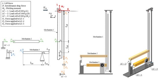 Figure 1 shows an overview of the external balance design, illustrating the three load cells ( and ) together with the different mechanisms employed for measuring lift force (), aerodynamic drag force (), and pitching moment ().