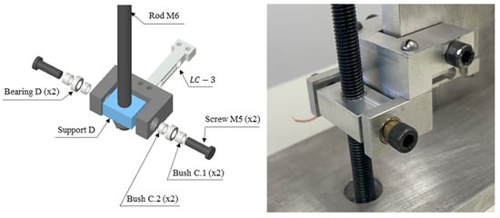 Figure 4 shows the assembly required to measure the pitching moment (). The load cell () is positioned horizontally, in the -axis direction. The assembly involves a bearing assembly (bearing D) and bushings (C.1), enabling rotational movement on one side of the load cell while keeping the other side stationary to prevent unintended motion (fixed to the mechanism 1).