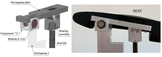 Figure 2 shows the junction between the load cell for measuring lift () and mechanism 3. The load cell is aligned in the same direction as mechanism 3 (in -axis) and is interconnected through a combination of two ball bearings (bearing A) and bushings (A.1, A.2, and A.3). The component ‘’B’’ is meticulously crafted to facilitate the integration between the bearing assembly and the load cell within mechanism 3. To ensure controlled movement, the opposing side of the load cell is intentionally immobilized, allowing only rotational motion at the junction with mechanism 3.