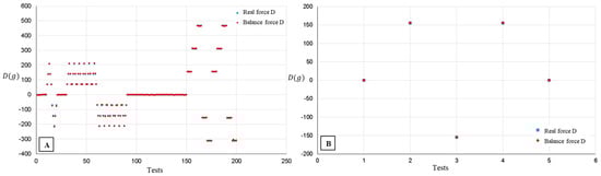 Figure 10 shows the real lift data, that is, the force matrix with the applied and known loads (blue points) and the lift values measured with the external balance (data in red). It can be observed that the real values are almost identical to the values measured by the external balance in the verification with calibration loads (Figure 10A). However, in the verification with 5 selected loads, there is a small deviation between the real load and the load measured by the balance for the 3 and the 5 load points (1, 3, and 5).