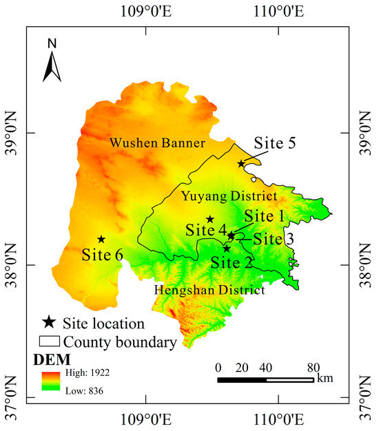 Figure 2 shows the location distributions of the in situ testing and sampling sites. Sites 1 and 3 were located in Liujiahaizi, Yuyang District, Yulin City. Site 2 was located in Caopiwa, Hengshan District. Site 4 was located in Huoluotan, Yuyang District. Site 5 was located in Xiaohaotu Township, Yuyang District, and Site 6 was located in Tongsi, Wushen Banner, and Inner Mongolia.