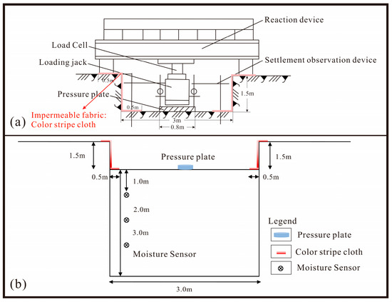 Schematic diagrams of the in situ water immersion load test. (a): A schematic diagram of a cross-section of the in situ water immersion load test pit. (b): A schematic diagram of the layout of the moisture sensor.