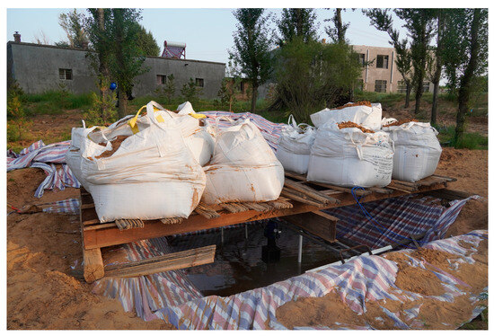In this test, the aeolian sand layer was used as the test layer, which was 1.5 m below the surface, as well as the bottom of the test pit, which was square and 3.0 m (length) × 3.0 m (width) × 1.5 m (height). The pressure-bearing plate was circular, with an area of 0.5 m2. The test loading adopted the loading counterforce method, the loading mode was the conventional slow method, and the loading was divided into eight levels. In order to monitor the effective penetration depth, three volume moisture sensors were arranged at the bottom of the test pit, 0.5 m away from the pit wall, and were located at 1 m, 2 m, and 3 m underground, respectively. The basis for soil saturation was that, if the value of the moisture sensor remains unchanged under the condition of continuous immersion, the soil is considered to be saturated. Figure 3a is a schematic diagram of a cross-section of the in situ water immersion load test pit, Figure 3b is a schematic diagram of the layout of the moisture sensor, and Figure 4 shows a photograph of the in situ water immersion load test.