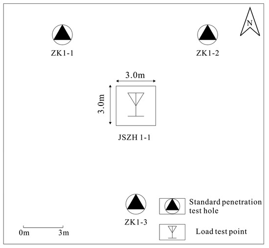 Three standard penetration test holes were arranged around each water immersion load test pit and standard penetration tests were conducted at 1 m intervals in each test hole. Following the test, the number of hammer blows in the borehole at different depths was determined. Subsequently, the number of hammer blows in the three test holes surrounding the same test pit was averaged to determine the number of hammer blows at different depths in the test pit. Figure 5 shows a schematic of the standard penetration test layout and Figure 6 shows a photograph of the field test.