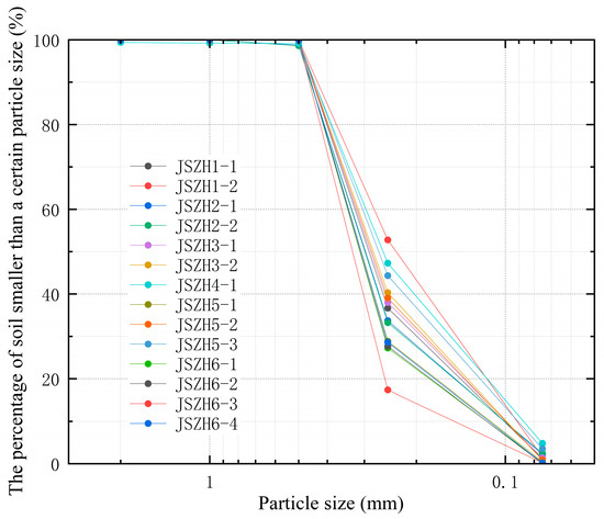 Figure 8 shows the particle size gradation curve of the disturbed sample. The results show that the particle size components of the soil samples in each test pit were mostly concentrated above 0.075 mm. The mass of particles between 0.25 and 0.5 accounted for the main part of the total mass, the mass of particles between 0.075 and 0.25 accounted for the minor part of the total mass, and the clay content was less than 10%. The uneven coefficients Cu were all less than 5, and the curvature coefficients Cc ranged from 1 to 3. It was a well-graded homogeneous soil.