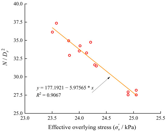 Equation (3) links the number of hammer blows (N), the relative density (), and the effective overlying stress (). Among them, the value of N was obtained from the in situ standard penetration test, whose results are listed in Table 2. The maximum dry density (), minimum dry density (), and dry density () in Equation (4) were obtained from the indoor geotechnical test, whose results are listed in Table 3. The effective overlying stress () was calculated according to Equation (7), whose results are listed in Table 4. The density value in Equation (7) was obtained from the indoor geotechnical tests. Next, the values of parameters a and b in Equation (3) were obtained by fitting the test results.