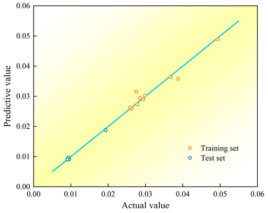 In this study, 14 sets of sample data were collected. Ten sets of sample data were used as training sets (Table 6) and four sets of sample data were used as test sets (Table 7). The water content, dry density, specific gravity, void ratio, and saturation were used as input variables, and the collapsibility coefficient was used as the output variable.