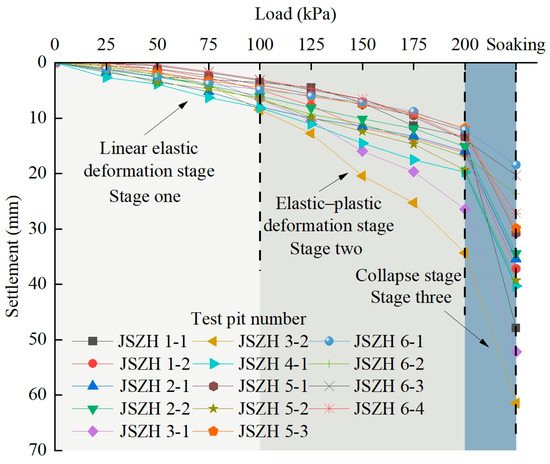 Through the in situ water immersion load test, the vertical settlement deformation curves of the soil in each test pit under different loads were obtained, as shown in Figure 12 (P-s curves; P is the load and s is the settlement).