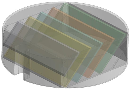 The scrubber has a central inlet perpendicular to the vertical axis (3) through which the contaminated gas enters the system, the condensate outlet is located at the bottom (1), and the cleaned gas leaves the system through the cleaned gas outlet (10). A water nozzle (6) is mounted in the scrubber, which generates droplets (5), which then collide with the contamination particles (4), and after the coalescence, they leave the system through the condensate outlet (1). At a distance h2 above the water nozzle, the first row of demisters (7) is mounted, which consists of flat blades inclined at an angle of 45°. There is also a second row of demisters higher up, with both demisters manufactured from plastic using a 3D printer. The geometry of the demister is shown in Figure 2.
