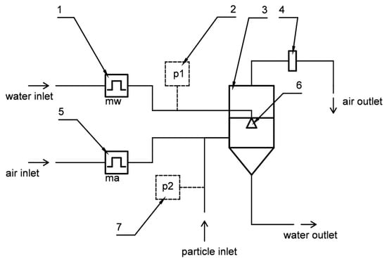 Test stand for measuring the separation efficiency of the spray scrubber (1, 5—flowmeters, 2, 7—manometers, 3—spray scrubber, 4—air filter, 6—water nozzle).
