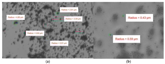 The air flow is generated by the compressor, and its flow rate is measured in the flow meter (5), which was thermal mass flowmeter FCI ST75 of range 0 to 86 Nm3/h with accuracy ± 2%. Dust particles in the form of crushed magnesium oxide, previously mixed with air in the fluidizer, are supplied to the air channel. The pressure of the air stream with dust particles is also measured by the manometer (7) with Wika S20 (WIKA Polska, Włocławek, Poland) pressure transducer of range 0 to 6 bar with accuracy ± 0.5%. Both air streams mix before entering the scrubber chamber. Then, the contaminated gas flows through the scrubber, where a water nozzle generates drops that collide with the dust particles. The purified gas fraction leaves the upper section of the scrubber and flows through the air filter (4). The filter is weighed before and after each measurement, which allows for measuring the mass of the dust fraction that could not be separated by scrubbing. It was selected due to its good availability and lack of toxic properties. Before the experimental tests, the dust was examined under a microscope to determine the grain size. The results of microscopic examinations using different magnifications are presented in Figure 4a,b.