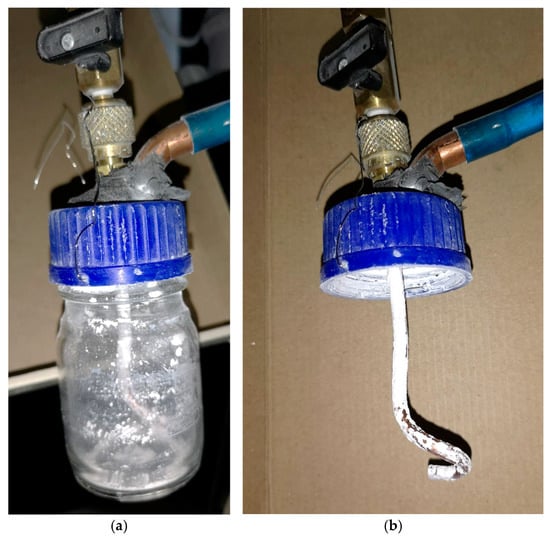 Figure 4a,b show the characteristic dimensions of the various dust fractions found. The smallest pieces of dust have a diameter of about 0.5 μm, the largest about 5 μm, and there are also larger groups of combined smaller fractions. Dust of this size was suitable for the planned measurements. Magnesium oxide tends to coalesce and stick together into larger agglomerations, especially in the presence of water. In relation to the operation of the scrubber, this is a desirable phenomenon inside the cleaning chamber, which should have a positive effect on the final separation efficiency. The polluted gas is sprayed with droplets generated in the water nozzle, which causes the dust to combine not only with the drops but also with other particles of wet dust. However, a problem may occur during introducing dust into the system, where narrower pipes may become clogged in the presence of water or even humid air. For this reason, the dust introduced into the system must be appropriately crushed and distributed in the inlet pipeline. In order to enable uniform introduction of dust into the main air pipeline, the fluidizer design was proposed. Its design is shown in Figure 5a,b, where Figure 5a shows the fluidizer with the external housing and Figure 5b shows the centrifugal inlet through which compressed air flows. The pipe inside the fluidizer has the internal diameter of 2 mm and the external housing has a volume of approximately 100 mL.