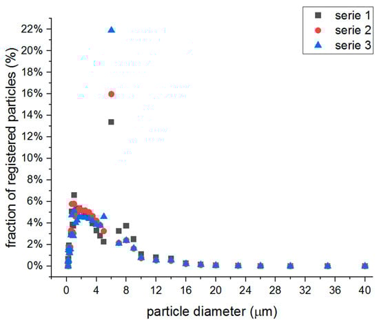 The particle size distribution was measured inside dry scrubber chamber, in the vicinity of the scrubber inlet. The measurement device was Topas LAP 322 Aerosol Spectrometer (Topas GmbH, Dresden, Germany), which allows to detect particle or aerosols of size from 0.2 μm to 40 μm. Obtained particle dimensions are presented in Figure 6. Three measurement series performed under the same conditions are presented in order to show the differences between the results caused by random circumstances. The characteristic peak value appears for the particle size of 6 μm for all measurements. The authors also tried to measure the particle distribution on scrubber outlet; however, the quantity of the particle flowing through the device was significantly lower and the number of registered particle fractions was too small to perform a reliable measurement.
