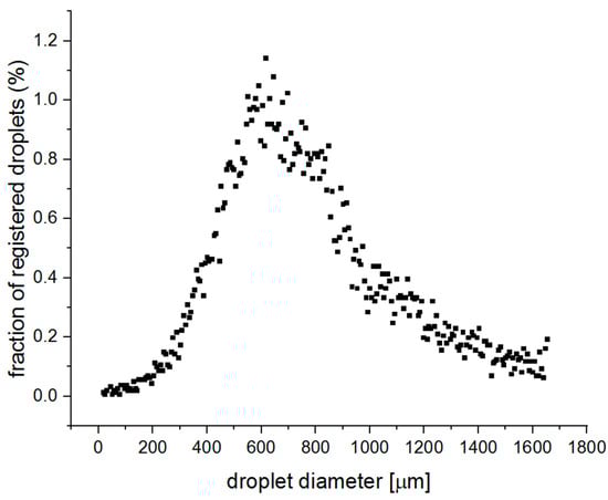 A water nozzle was installed in the scrubber, which generated drops that caught contaminants. A full-cone axial water nozzle was selected. According to the author’s estimations, a maximum vertical velocity of around 2 m/s should be expected in the scrubber chamber, depending on the gas flow rate at the inlet. This means that water drops with diameters smaller than the critical droplet diameter will be entrained by the air flow and may leave the system at the top and hit the air filter. Such a phenomenon is unfavorable for the operation of the scrubber, so a water nozzle with a relatively large size of the generated drops had to be selected. During the tests, several nozzles were tested using the Droplet Size Analyzer (AWK D) from the manufacturer “Kamika Instruments” (Warsaw, Poland). It is designed to measure the distribution of liquid droplets in air under the laboratory conditions in the range from 50 µm to 4 mm. After analyzing the distributions of several water and water–air nozzles (atomizers), it was decided that the Lechler 490.928 nozzle would be the most suitable for the planned experiments. The measurement results are shown in Figure 7.