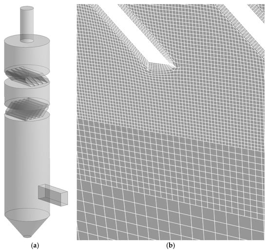 In order to acquire more information about the phenomena occurring inside scrubbing chamber, a simple numerical model of spray scrubber was prepared. However, for the purpose of this paper, only air flow was solved and analyzed. The mechanism of droplet and dust particles interaction was not analyzed. The geometry of scrubber investigated in laboratory was mapped as a 3D model and implemented into computational software, which is presented in Figure 8a, while the zoomed computational mesh in the vicinity of demister vanes is shown in Figure 8b.