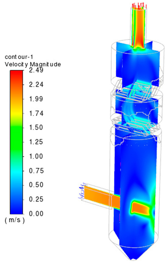 The computational model has been calculated and the steady state solution was obtained. The results show contours of velocity inside spray scrubber, which is shown in Figure 9.