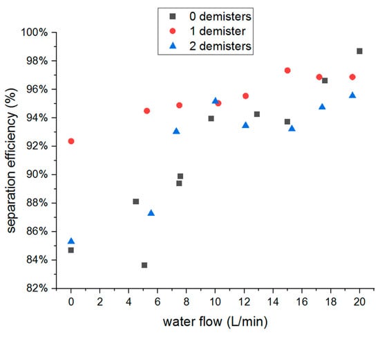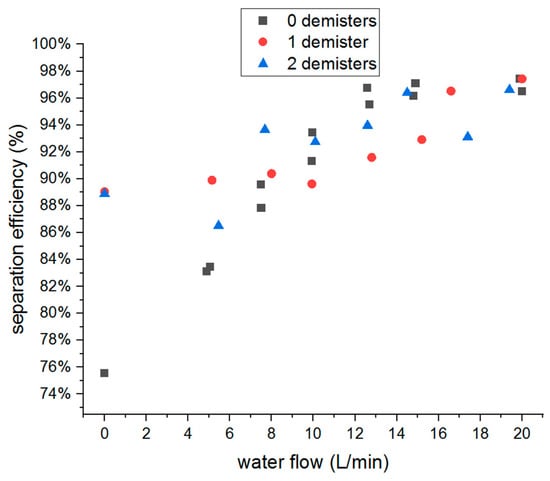 During all experimental series, approximately 8 g of MgO powder was placed in a fluidizer before the measurement procedure. Figure 10 and Figure 11 show the dependence of the mass separation efficiency on the water flow rate at the water nozzle. Three cases are compared in both graphs: without a demister (black squares), with one demister (red dots), and with two demisters (blue triangles). Figure 10 shows the results for the inlet velocity of 2 m/s, and Figure 11 shows the results for 4 m/s. The separation efficiency was calculated using Formula (1). According to the figures, there is a visible beneficial effect of using one demister for both tested flow velocities and a beneficial effect of using the second demister for a speed of 4 m/s. However, for a speed of 4 m/s, the second demister only slightly increases the separation efficiency compared to the system with one demister, and for a speed of 2 m/s, the second demister only slightly improves the separation efficiency compared to the system without demisters.