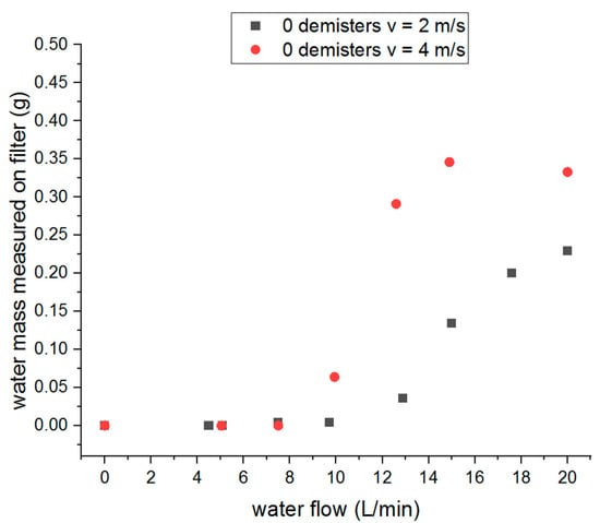 Figure 12 shows the mass of moisture released on the filter for an air flow speed of 2 m/s and 4 m/s for the case without demister. The use of one or two demisters completely solved the problem of droplet entrainment for the entire operating range of the water nozzle. Even at the highest water flow, no moisture was observed on the filter, so the results for the cases with one and two demisters are not included in the chart. The accuracy of the weighting scale (given by the producer “Radwag”) was on a level of 0.1–1 mg. Two cases without a demister are compared in the graph: for the lower velocity (black squares) and for the higher velocity (red dots). The first recorded droplets appeared at a water flow of 13 L/min for the air inlet speed of 2 m/s and 10 L/min for the air inlet speed of 4 m/s. For lower water flow rates, the drops were not entrained by the air flow to the upper part of the scrubber. At a speed of 2 m/s, the mass of separated water increased with the increase of water flow rate until it reached a maximum value of 0.23 g. At a speed of 4 m/s, the maximum water mass was 0.35 g, which was significantly more than for the lower air speed.