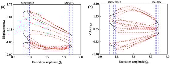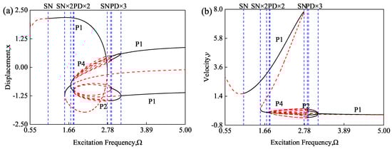 Given system parameters = 2.4 and = 0.3, Figure 5 shows the predicted trends of node displacement x and velocity y in relation to changes in excitation amplitude . In Figure 5, the predictions of a bifurcation tree completely transitioning from period-1 to chaos are illustrated. The period-1, 2, 4, and 3 motions are labeled P1, P2, P4, and P3, respectively. The period-2 motion arises from the period-doubling bifurcation of period-1 motion, and period-4 motion results from the period-doubling bifurcation of period-2 motion.