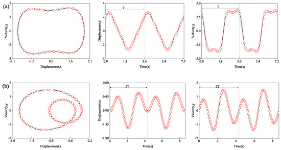 The phase trajectories and wave-forms of stable periodic motions are shown in Figure 4. From the graph, the trajectory of period-1 has a circle, and the wave forms have one peak in one period. There are two circles in the trajectory of period-2 motion, with the slowly changing part having a smaller orbit and the rapidly changing part having a larger orbit. Correspondingly, the wave-forms have two peaks in one period. The phenomenon is also appropriate for period-4 motion. For period-3 motion, only one circle is observed because there is a low rate of change for the displacement x.