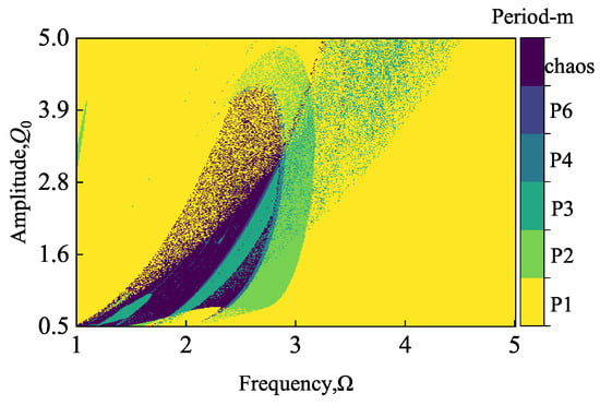 Figure 7 is a dual-parameter map which describes the period transformation of a typical Holmes–Duffing oscillator with the excitation amplitude (0.5, 5) and frequency (1, 5). A clear and accurate evolution of periodic motion and chaotic processes is provided in Figure 7. The Duffing oscillator is predominantly in period-1 motion, with high-period motion occurring at lower frequencies. It is notable that period-1 and period-2 motion are closely neighboring. Additionally, the adjacent relation exists between period-2 and period-4 motion, and is also appropriate for period-3 and period-6 motion. The periodicity and chaos shown in Figure 7 are consistent with the inferences illustrated in Figure 1 and Figure 5.