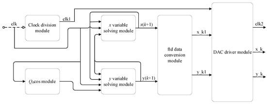 The model block diagram of the Duffing model in FPGAs is shown in Figure 8. In Figure 8, the function of the clock division module is to divide the external input clock (clk) into clk1 clock signals by internal count. The clk1 is connected to the DAC driver module as the clock signal for the DAC chip; clk is the clock signal for the variable-solving module and module, respectively. The module is used to store cos values in a ROM register and continuously provide the corresponding cos value based on the clock signal. The value of the cosine function is calculated according to the set integration step. Then, the pre-calculated internal driving force of the Duffing oscillator is converted into a .mif file and stored in the fixed-size ROM. This allows for quick access through the look-up table method. Then, the variable value is entered into the y variable-solving module for solving.The ftd data conversion module receives 32-bit data and from the variable-solving module as input. Then, it performs appropriate bit-width conversion, converting the 32-bit data into 14-bit data x_k1 and y_k1, often including truncation to ensure the output data range aligns with the range of the DAC chip. The task of the DAC driver module is to provide the clock signal for the DAC chip and output the variable value. The variable-solving module realizes the solution of Equation (11). In the design, the two state variables and are solved separately. The state variables at the current moment and are fed back to the variable-solving module as input for solving the state variable value at the next moment.