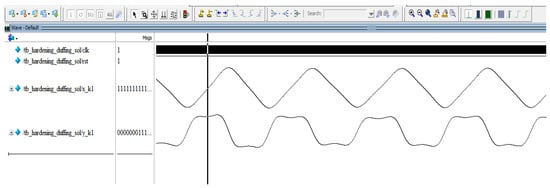 In the computation module shown in Figure 9, three floating-point multipliers, one floating-point summator, and one floating-point subtractor serve as shared resources for all data operations. The solution for the discrete system is structured into five steps. Given that the 32-bit multiplier requires substantial area, we store data in registers after each calculation step. This approach enhances the module’s maximum operating frequency by ensuring data stability and optimizing pipeline efficiency. The designed circuit model was simulated by Modelsim SE 10.5. The Modelsim simulation result of Duffing at period-1 motion is shown in Figure 10.