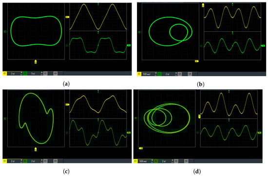 We constructed a validation environment for the Duffing system as seen in Figure 11. The DAC module of the Duffing chaotic digital system is connected to an oscilloscope via a dual-ended cable with BNC connectors. The output of state variable x and y are connected to the oscilloscope. The screen of the oscilloscope shows the x-y phase trajectories and wave-forms of the Duffing system. According to the periodic phenomenon shown in Figure 7, we adjust the parameters of external amplitude and frequency to observe various periodic motions. The four types of phase trajectories and wave-forms of periodic motions are shown in Figure 12. Under different parameter conditions, Duffing oscillators have different periodic motion states.