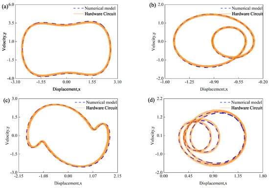 Duffing phase trajectories of period motion for numerical model and hardware circuit: (a) period-1 motion with = 1.73, = 2.8; (b) period-2 motion with = 2.9, = 2.8; (c) period-3 motion with = 3.309, = 2.8; (d) period-4 motion with = 2.8606, = 2.8.
