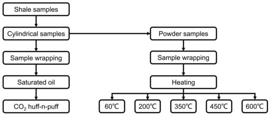 Workflow of pyrolysis and CO2 huff-n-puff experiments.