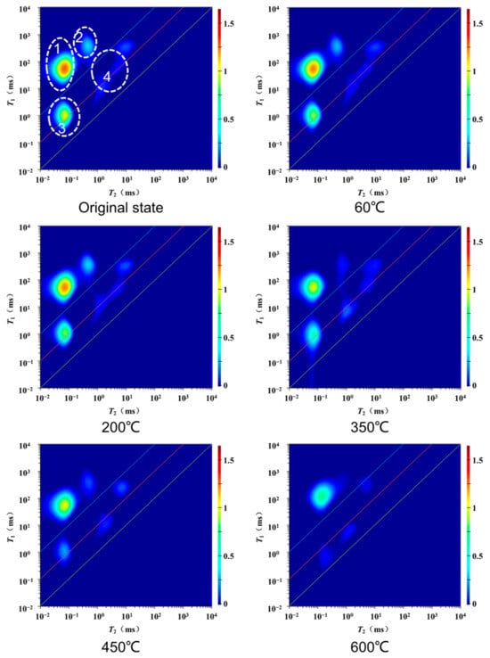 Considering the temperature characteristics of oil and water components, as shown in Figure 1, we chose the temperature ramp sequence of 60 °C, 200 °C, 300 °C, 350 °C, 450 °C, and 600 °C for pyrolysis experiments on shale samples to perform shale component analysis. The procedure entailed gradually heating the shale samples at a rate of 5 °C per minute, and holding at each temperature for 3 h to ensure adequate release of components under that temperature condition. The experiment used parallel samples crushed to 60 mesh, and conducted multistage anaerobic pyrolysis experiments according to the temperature sequence. Following each temperature increase, 1D and 2D NMR spectra were recorded at the various stages. Pyrolysis experiments combined with NMR analysis used 2D NMR spectra to distinguish oil and water, constructing a fluid component map that characterizes total oil-bearing and movable components.