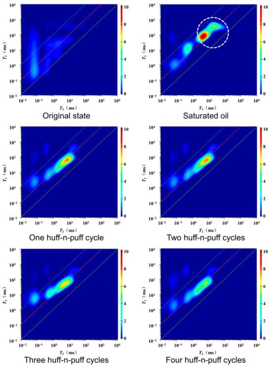 Shale plug samples were subjected to four cycles of CO2 huff-n-puff experiments according to the procedure in Figure 2, and the NMR T1-T2 spectrum was measured after each cycle. Figure 4 displays the T1-T2 spectra of sample S42 in its original state, oil-saturated state, and at the end of each huff-n-puff cycle, normalized for easy comparison. The T1-T2 spectrum signal of the sample was not significant in the original state, but it increased significantly after oil saturation, and subsequently decreased as the number of huff-n-puff cycles increased. Upon observing each huff-n-puff cycle individually, the most pronounced signal change occurred during the first cycle, with diminishing changes in subsequent cycles. This indicates that in the first huff-n-puff cycle, the oil in the large pores was initially produced, and as the number of cycles increased, the production gradually decreased. At this point, the injected CO2 overcame the capillary pressure and entered the smaller pores, and the oil in these regions began to be produced. From the location of the fluid signal changes, the movable oil is mainly in the marked positions in Figure 4, that is, the large pore region where the change was most significant in the first huff-n-puff cycle. Figure 5 and Figure 6 present the T1-T2 spectra for samples S28 and S85 post oil saturation and after four CO2 huff-n-puff cycles, with the most significant changes occurring in the movable oil regions. From the mechanism of CO2 huff-n-puff experiments, CO2 is soluble in oil. During the injection process, CO2 comes into contact with and dissolves in the oil in the samples, causing the oil volume to expand and become movable oil. During the production process, this movable oil is produced due to fluid drive, increasing the recovery rate. Additionally, the dissolved CO2 also reduces oil viscosity and acts as an extractant, further enhancing oil fluidity. As the amount of dissolved CO2 in the oil increases, so does the system’s energy. During the pressure reduction process, the dissolved gas rapidly expands and escapes, driving the oil to flow out and increasing production capacity.