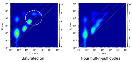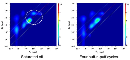 NMR T1-T2 spectra of the plunger sample S28 with saturated oil and four cycles of CO2 huff-n-puff.