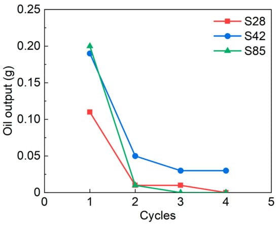 Comparison of oil production after each cycle for three shale samples.