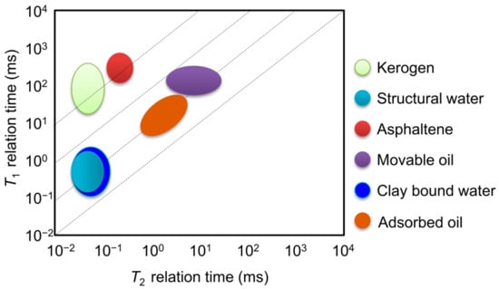 The objective of shale component analysis is to accurately identify, distinguish, and quantify both hydrocarbon and aqueous phases, a goal well-suited to NMR techniques. NMR capitalizes on the 1H NMR phenomenon, where different components have distinct nuclear magnetic relaxation mechanisms, enabling the differentiation of various components. Compared to conventional sandstone reservoirs, shale contains multiple hydrogen-containing components, including movable oil, water, kerogen, structural water, clay-bound water, asphaltene, and other signals. The conventional one-dimensional (1D) NMR T2 spectrum, being a composite response of NMR signals from various fluid components in the rock, often fails to clearly distinguish between these components in shale [11,12]. The two-dimensional (2D) NMR T1-T2 method can effectively avoid the aforementioned issues. The 2D NMR method takes advantage of the different molecular diameters of hydrogen-containing substances, resulting in more significant differences on the T1-T2 spectrum. This method enables the identification of different hydrogen-containing components using a reference template, becoming the main approach for NMR-based fluid component discrimination in shale oil [13,14,15,16,17,18]. Scholars have observed variations in the position and morphology of identical fluids across 2D fluid component templates constructed from NMR experiments on diverse shale samples. These discrepancies arise from variations in the geological settings, diagenetic histories, and laboratory-specific measurement parameters of shale samples. All of these factors can influence NMR response features and introduce variability in the measurement results. Kausik et al. compared the results of Bakken shale measured on NMR instruments at 2 MHz and 400 MHz frequencies and found that high-field NMR can help identify the solid organic matter and clay-bound water components of shale [19]. Furthermore, they also conducted NMR measurements on extracted kerogen and asphalt from shale, suggesting that different frequency instruments and temperature environments can affect the morphological distribution of measured fluid components [20]. Li et al. used a 21 MHz NMR core analyzer to conduct tests on shale from the Bohai Bay Basin, and concluded that terrestrial and marine shale have different fluid component distributions due to different depositional environments [21]. The current research highlights the substantial benefits of 2D NMR for shale component identification, enabling the accurate recognition and partition of components, but it still requires assistance from other experimental techniques, which is also the focus and challenge in the field of 2D NMR component analysis.