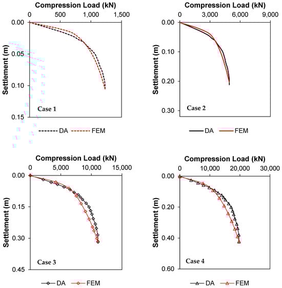Predicted compression load–settlement curves by DA for different large-scale cases.
