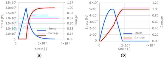 Gft,c in Equation (5) represents the energy required so that the crack can propagate [33], which depends only on the material, either in tension or in compression. lc is the element size. However, defining the size of an element is not necessarily straightforward. In this contribution, it is assumed that the element size lc is equal to the cubic root of the element’s volume. It assumes that all elements should be as cubic as possible in the simulations, so that the length of the element in each direction is equal to lc.