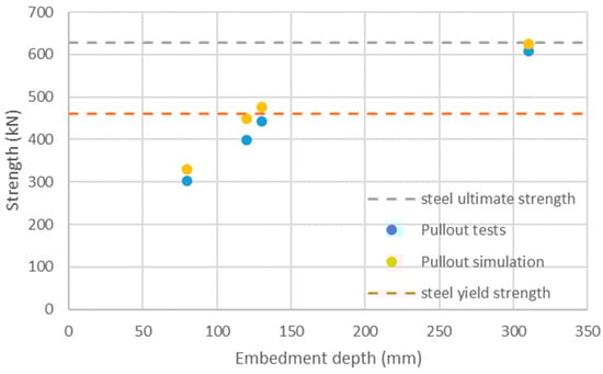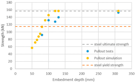 Figure 13 shows the experimental setup that the simulation aims to reproduce. Several experiments have been carried out to determine the impact of the embedment length. The simulations show similar trends as the experimental results (Figure 14). The critical embedment length at which failure transitions from concrete failure to steel failure is between 120 and 130 mm (both experimentally and numerically).