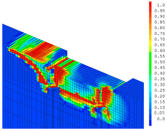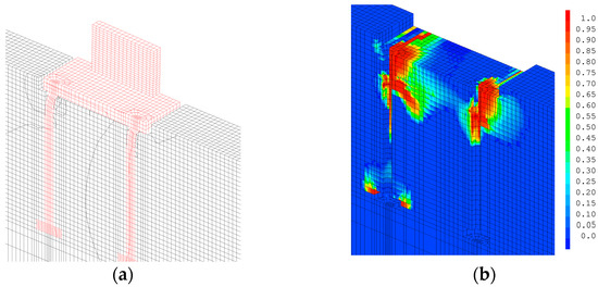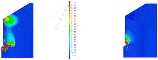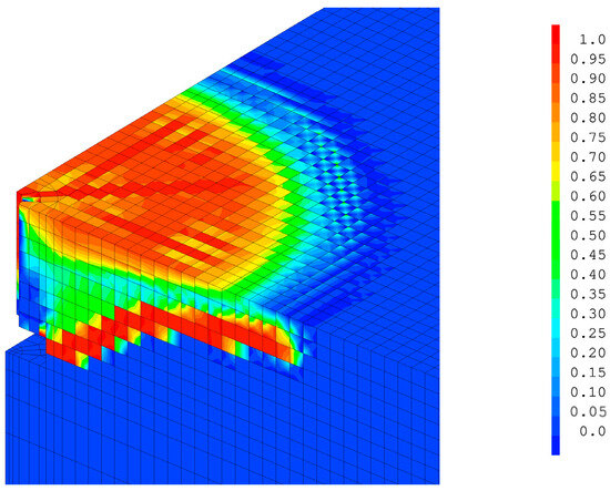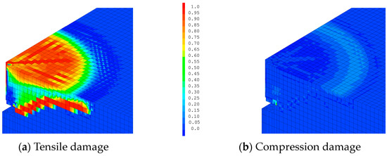 It is important to first compare the significance of the damage due to tension and the damage due to compression. In the case of a rigid stud and for a Gfc of 50,000 N/m, the tensile damage Dt from Equation (3) mainly follows the trajectory of the crack cone (Figure 9a), while the compressive damage represents the crushing of the concrete above the stud head (Figure 9b). Tensile damage remains predominant, but compressive damage accounts for 14% of the damaged volume at the end of the calculation, which is not negligible. In the case of a more flexible stud, it is clear that the total damage in Figure 5 is mainly due to tensile damage (Figure 10a), as the compression damage (Figure 10b) remains very limited (only 2% of the damaged volume).