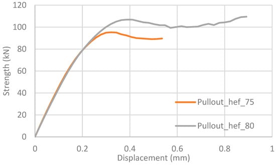 Comparison of force–displacement curves for a simulation with embedment lengths of 80 mm and 75 mm.