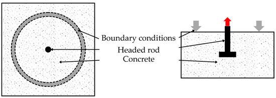 The numerical boundary conditions are the same as in the experimental setup. Experimentally, the boundary conditions are created by metal bars anchored to the ground. For the simulation, the boundary conditions will be applied to the concrete mesh, using the same geometry as in the experiment, by applying a constraint to the relevant nodes. To reduce the computational time, the simulations utilize symmetry axes, representing a quarter of the experiments. Additionally, perfect bond conditions are assumed between the reinforcement and the concrete that impose the same displacements between both the materials through additional cinematic relations [36]. The forces are mainly transmitted through the head of the stud, given the size of the stud head and the low adhesion between the rod and the concrete, considering the friction between the stud and the concrete to be negligible. Therefore, the interaction between the anchor and the concrete will be modeled as a frictionless sliding contact (unilateral contact condition).