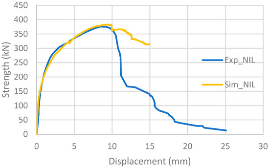 For longer embedment lengths (100 mm and 310 mm), failure occurs at the stud due to steel shear, both numerically and experimentally (Figure 19). The maximum resistances from the tests are very close to the simulations (Table 6).