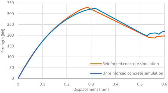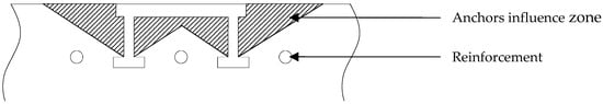 Finally, the influence of reinforcements within the concrete is studied. Simulations without reinforcements are proposed. In the studied configuration, the presence of reinforcements does not change the force–displacement curve (Figure 15). It can be explained by the high strength of the concrete and the relatively high deformation of the stud. Indeed, for small embedded lengths (less than 100 mm), the reinforcements are too deep in the concrete to have any effect; the reinforcements are not within the influence zone (Figure 16) during a pullout test. For higher embedment lengths, the concrete is rigid enough not to deform; so, it is the stud that deforms, as observed in [2].
