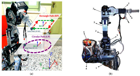For theoretical and experimental validation, circular and rectangle paths (CP/RP) were selected in different areas of the manipulator workspace, as shown in Figure 4a. Rectangle paths were selected in order to study the effect of rapid direction changes and the effect of a variable TCP velocity when direction was constant.