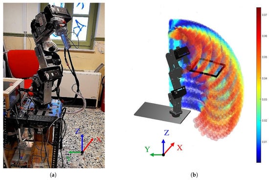 The experimental investigation utilized the SMM prototype developed in our laboratory, executing the predefined task paths and analyzing the acquired sensor data using the established theoretical model and performance evaluation metrics. The three-degree-of-freedom (DoF) SMM prototype used for this work is presented in Figure 4b at a reference anatomy along with the main components used for the structuring and operation. The metamorphic structure comprised three pseudojoints, assembled to achieve a robot with orthogonal axes configured in a Z–X–X arrangement when set to its reference anatomy. The properties of the metamorphic structure, system architecture, and control software along with the hardware setup are presented in detail in [29].