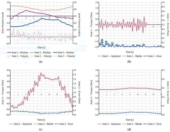 Figure 6a presents the joint positions and velocities for the simulated trajectory, while Figure 6b–d show the simulated torques and the corresponding absolute errors. The simplified dynamic model closely approximated the MATLAB dynamics solver, with torque deviations consistently below 0.2 Nm at all joints. Joint 2, which carried the main load, exhibited the largest torque values and deviations. Joint 1 also exhibited greater torque deviations during dynamic transitions. The error graphs confirmed the model’s consistency in capturing general trends but highlighted limitations in precision under high-load conditions.