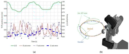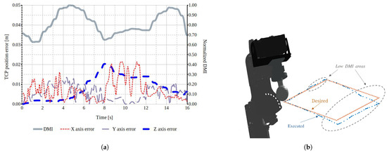 TCP trajectory error (ID: 2, task path: 19). (a) TCP trajectory error graphs (desired vs. executed). (b) TCP position error in 3D space.