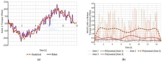 In Figure 9 and Figure 10, the torques and velocities calculated by the dynamic model and the ones produced by robot joints are compared. In Figure 9a and Figure 10a the ability of the established dynamic model to effectively capture the general trend in torque and velocity is illustrated. The torque comparison, shown in Figure 9a, reveals that the theoretical calculations were noticeably smoother, largely due to the simplified model used in MATLAB. The experimental data from the robot presented fluctuations, primarily attributed to the PID controller’s influence and unmodeled dynamics such as friction, joint compliance, and external disturbances. To extract a more detailed view of the observed discrepancies, the deviation between theoretical and experimental data is illustrated in Figure 9b and Figure 10b. In both graphs, polynomial regression trend lines were employed to analyze the deviation patterns. Joints 1 and 2 produced lower effort values, with their discrepancies exhibiting smaller variations (approximately 0.5 Nm), primarily due to evenly distributed sensor noise over the task’s duration. The fluctuations in torque deviations observed for joint 2 correlated with the overall effort trend, suggesting that joint friction had a more significant impact. Additionally, transient effects and controller response contributed to the observed variations. The observed torque peak deviations reached approximately 3.5 Nm, with a median deviation value of 1.5 Nm. Velocity discrepancies displayed similar sensitivity to unmodeled system uncertainties, with trend lines remaining below 0.2 rad/s, which was considered adequate for this analysis.